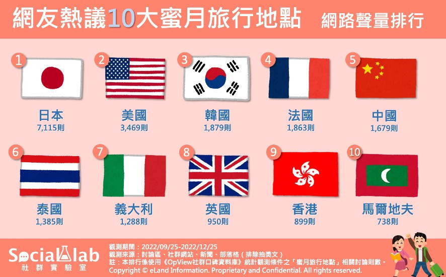 《Social Lab社群實驗室》本次透過《OpView社群口碑資料庫》追蹤近三個月內「蜜月旅行地點」相關話題聲量,讓我們來看看網友都推薦哪些適合蜜月旅行的好去處吧。