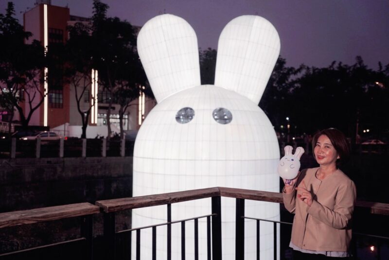 而今年小提燈「光光兔」在曝光後掀起熱潮,民眾詢問度破表,縣府特別在萬年溪景觀橋河段上打造一座10米高的巨型「光光兔」,白白胖胖的光光兔從溪中探出頭來,超級俏皮可愛。周春米縣長提著「光光兔」小提燈,來找光光兔合影,充滿童趣,邀請大家一起來賞燈同樂。