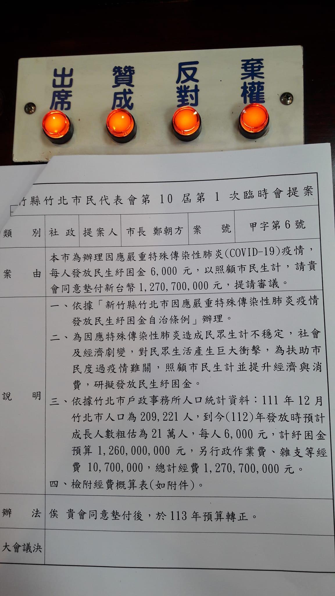 竹北市通過發放紓困金「自治條例」,只要1月12日入戶籍者都能領取6000元。圖片來源:翻攝自市民代表蔡文苑臉書