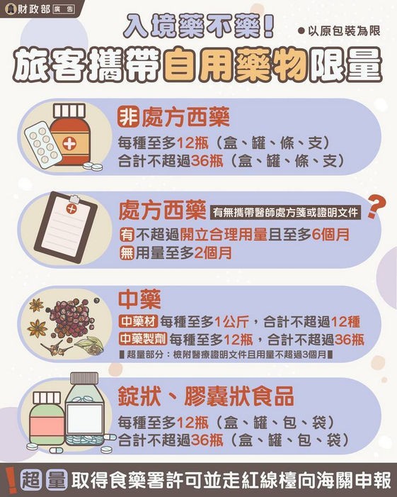 衛生局表示,如在國外購買藥品回國,必須遵守「入境旅客攜帶自用藥品限量」規定,每人可攜帶多少藥品入境有明確規範,藥粧店可買到非處方藥如EVE止痛藥、妙利散、金肝保精等,每種至多12瓶(盒、罐、包、袋),合計不超過36瓶(盒、罐、包、袋)為限;此外,每種中藥材至多1公斤,合計不可超過12種;中藥製劑每種至多12瓶(盒),合計以不超過36瓶(盒)為限,逾量藥品如未經衛生福利部核准,領有輸入同意文件是不能攜帶入境,而且攜帶入境藥品千萬不可販售,以免觸法,詳細規定可至衛生福利部食品藥物管理署網站(首頁/業務專區/藥品/個人輸入自用藥品規範專區)查詢。