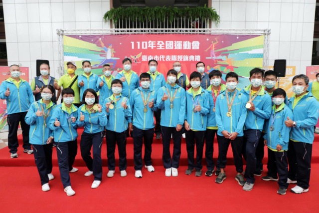 (今傳媒/記者陳宥森報導)110年全國運動會將於10月16日至21日於新北市登場,台南市政府於今(8)日舉行代表隊授旗儀式,市長黃偉哲親自將市旗交給台南市體育總會理事長吳志祥,期許台南市代表隊旗開得勝,每位選手都能突破自我,再創感動與驕傲,為台南奪得佳績。市議員陳秋宏、沈震東、李啟維、蔡旺詮也都來到現場表達關心與選手致意。