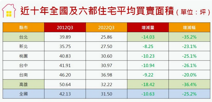 高通膨、高房價,是否正侵蝕台灣民眾的「居住品質」?依據內政部「不動產資訊平台」最新資料顯示,去(2022)年第三季全台平均交易坪數為31.5坪,相較2012年同期的42.13坪,短短10年內就減少10.63坪、約25.2%,等於直接減少一間大套房的坪數。