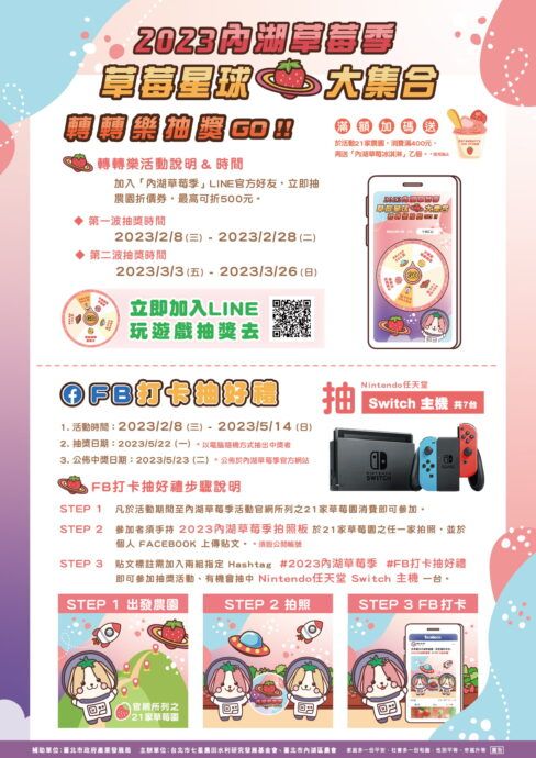 凡於內湖草莓園活動期間,至內湖草莓園配合之草莓農園,持「2023內湖草莓季-草莓星球主題手拿牌」於FB拍照打卡並標註「#2023內湖草莓季 #FB打卡抽好禮」,即可參加抽獎活動,好康機會千萬不可錯過!