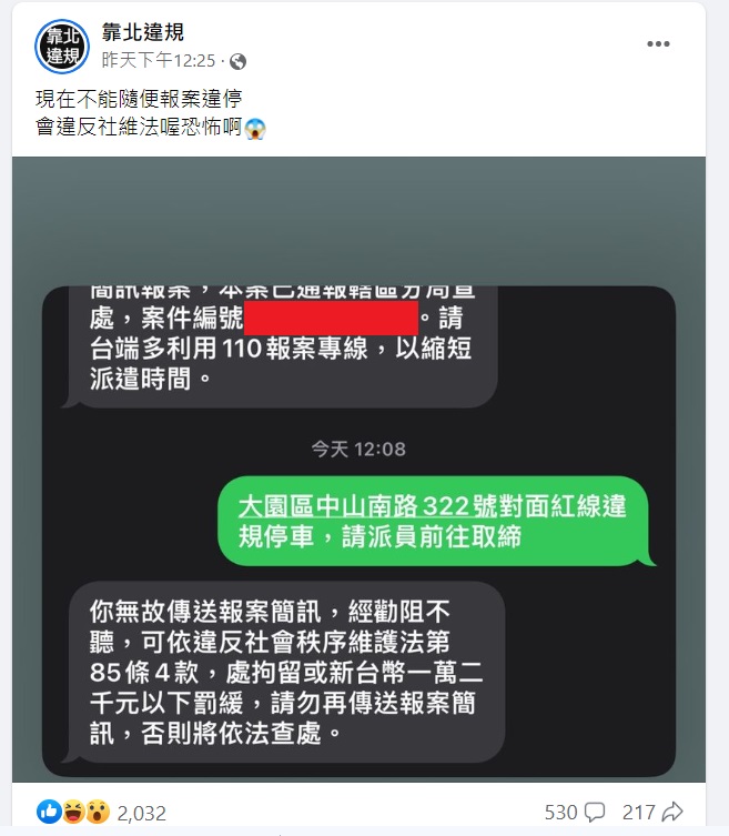 臉書專頁「靠北違規」曬出一張簡訊報案的截圖表示,「現在不能隨便報案違停 會違反社維法喔恐怖啊」。只見報案民眾透過簡訊報案表示,「大園區中山南路322號對面紅線違規停車,請派員前往取締」。不料警方竟回覆,「你無故傳送報案簡訊,經勸阻不聽,可依違反社會秩序維護法第85條4款,處拘留或新台幣一萬二千元以下罰鍰,請勿再傳送報案簡訊,否則將依法查處。」