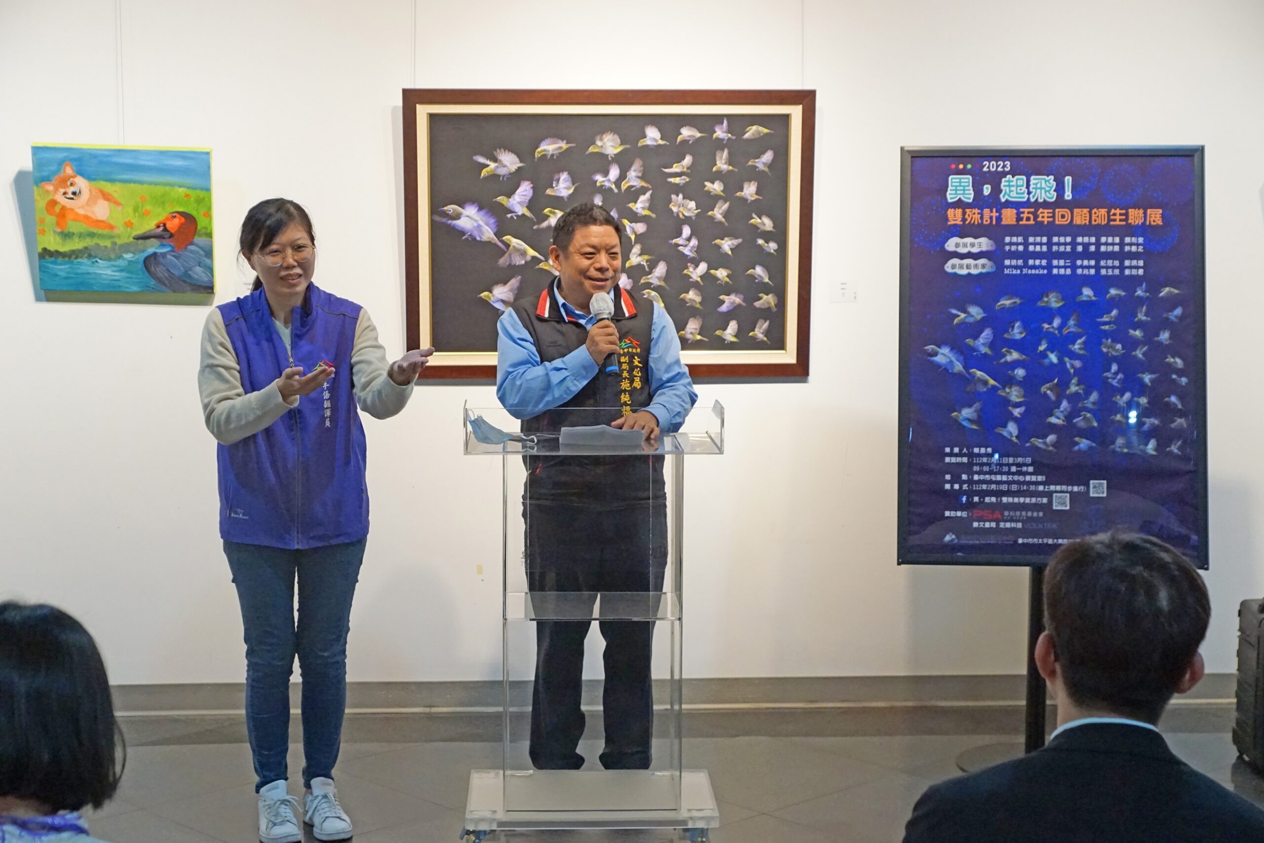 臺中市屯區藝文中心於今(19)日辦理「異,起飛!雙殊計畫五年回顧師生聯展」開幕式,結合特殊教育與藝術專長培育,即日起至3月5日止,展出油畫、膠彩、攝影、袖珍立體及自媒體等優秀藝術作品,歡迎民眾踴躍前往欣賞,同時也為這群特殊且優秀的孩子加油打氣。
