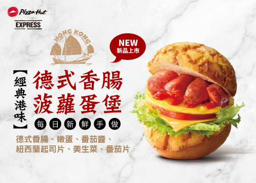 必勝客EXPRESS板橋車站店持續優化菜單,這次全新打造早餐新品「德式香腸菠蘿蛋堡」,採用必勝客EXPRESS廣受歡迎、每天新鮮手做的菠蘿麵包堡體,夾入獨特煙燻香氣、Q脆有彈性的德式香腸、嫩蛋、紐西蘭起司片、美生菜、在地鮮採番茄片、番茄醬等豐富食材配料,港式菠蘿與德式香腸完美融合,不但充滿巧思,更有多層次的美味口感,讓消費者耳目一新,全台只有必勝客EXPRESS板橋車站店才吃得到!「德式香腸菠蘿蛋堡」每天早上10:30前限量供應,單點89元,加$10就送原價$35飲料,讓上班族、學生從一早就能享受美食帶來的好心情!