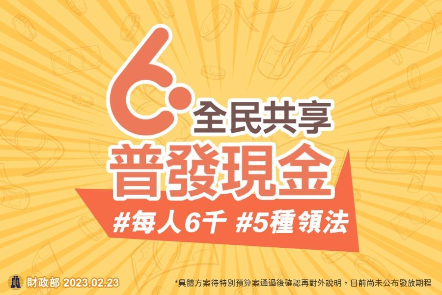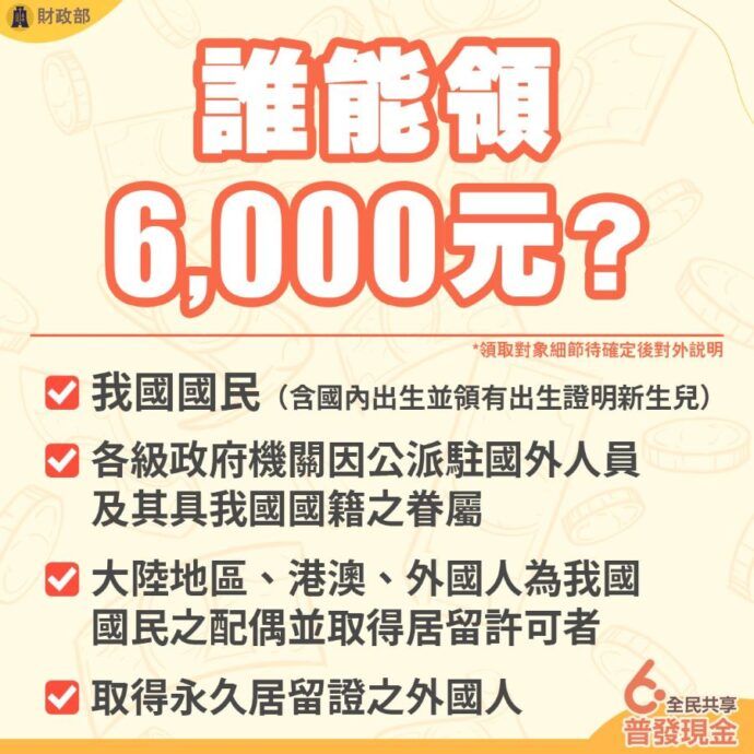 財政部指出,因應國際政經變局、通膨壓力上升,衝擊全球經濟與民生需求,因此依疫後強化經濟與社會韌性及全民共享經濟成果特別條例,辦理普發現金,與全民共享經濟成果,只要在指定時間內符合發放資格,每人都能領6,000元,對象包含:我國國民(含國內出生並領有出生證明新生兒)、各級政府機關因公派駐國外人員及其具我國國籍之眷屬、大陸地區人民與港澳居民及外國人為我國國民之配偶,並取得居留許可者、取得永久居留證之外國人。