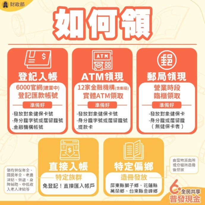 發放方式為方便民眾領取,規劃「登記入帳」、「ATM領現」、「郵局領現」、「直接入帳」及「特定偏鄉造冊發放」5種: