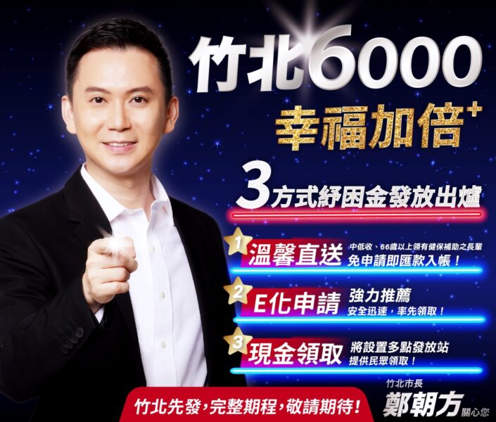 【焦點時報/記者羅蔚舟報導】不等中央發放民生紓困金了!新竹縣竹北市公所1月12日拍板通過發放每位市民民生紓困金6000元,加上中央振興金6000元挹注,竹北市民每人可領1萬2千元,全台最高。竹北市公所今(2/24)日宣布紓困金發放方式,預計採「溫馨直送」、「E化申請」、「現金領取」3階段進行;預計兒童節前夕發放,四月中完成,搶先中央發放期程、全台最快速。