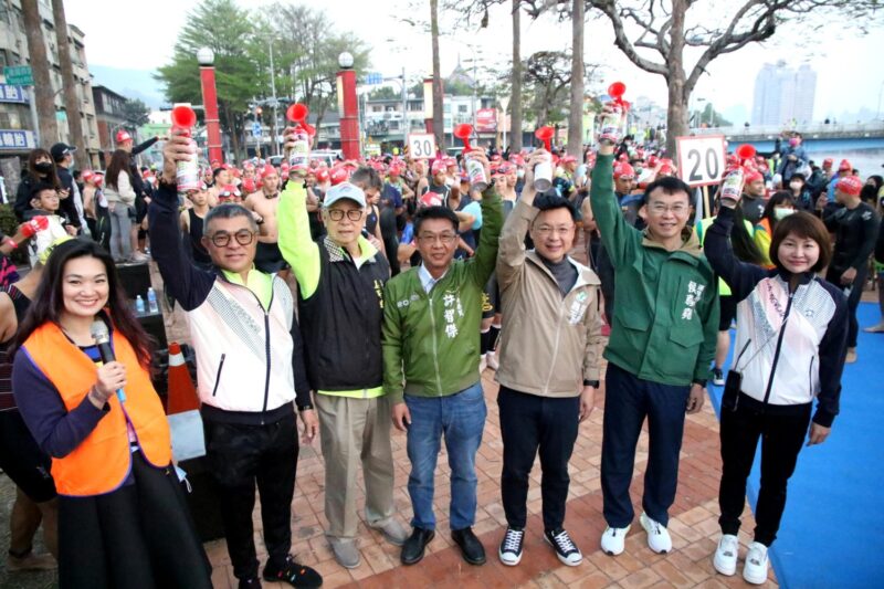 2.維士比盃愛河國際鐵人三項競賽在高雄市運動發展局局長侯尊堯(右2)、立委趙天麟(右3)、許智傑(右4)與體育總會鐵人三項委員會主委姜寄生(左3)、新世紀環保公司董事長吳尚謙(左2)、女壘新世紀黃蜂隊領隊施采萱(右1)等人鳴笛起跑。