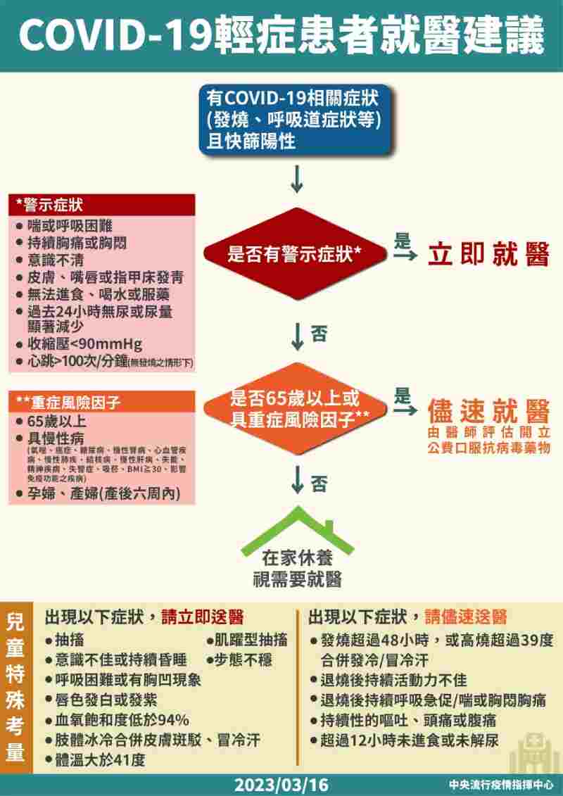 民眾若有COVID-19相關症狀(包括發燒、呼吸道症狀等)且快篩陽性,可先檢視自己是否有以下警示症狀,若有警示症狀應立即就醫: