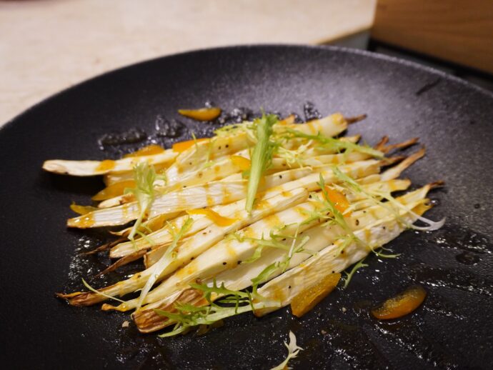 ▲溫泉茭白筍「飽水」又清甜,簡單調味火後,淋上新鮮金棗熬成甜蜜醬汁,金棗蜜餞切片點綴,引人垂涎。(圖/礁溪長榮鳳凰酒店提供)