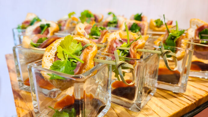 ▲長榮鳳凰酒店下午茶的「一串心」,將空心油豆腐填入香腸、香菜再以竹籤串起,橫放在玻璃杯上,食用時可蘸杯底的醬油跟甜辣醬,一口一串,時髦又涮嘴。(圖/礁溪長榮鳳凰酒店提供)