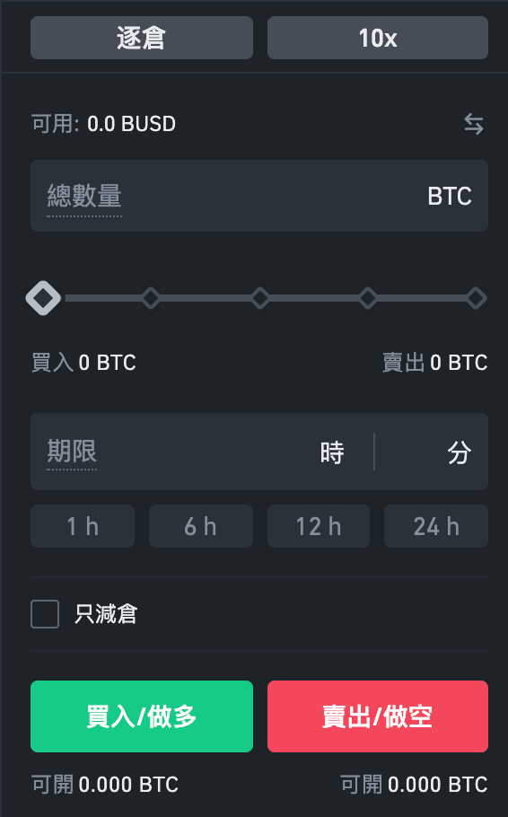 2.在選定交易對後右側會出現交易選項設置。「總數量」的部分填入總共需要購買的數量 ,最小數量需大於 10,000 USDT;「期限」的部分填入要在多長時間內完成所有交易,最短 5 分鐘,最長 24 小時。設置完成後即可選擇做多或做空。