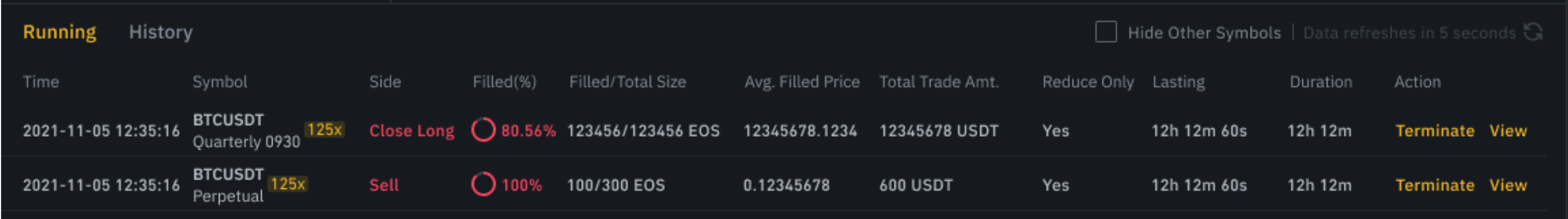 根據官網提供的說明,訂單設置完成後可在運行中 (Running) 看到交易詳情,可以在這部分觀察平均成交價格、訂單完成比例及總交易量等。若想手動停止交易只需點選終止(Terminate) 即可。