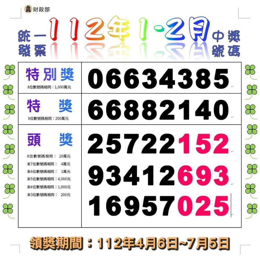 財政部25日公布112年1、2月統一發票中獎號碼,1000萬元「特別獎」的8位號碼為「06634385」;200萬元「特獎」8位號碼為「66882140」;另外3組20萬元「頭獎」的8位號碼分別是「25722152」、「93412693」、「16957025」。