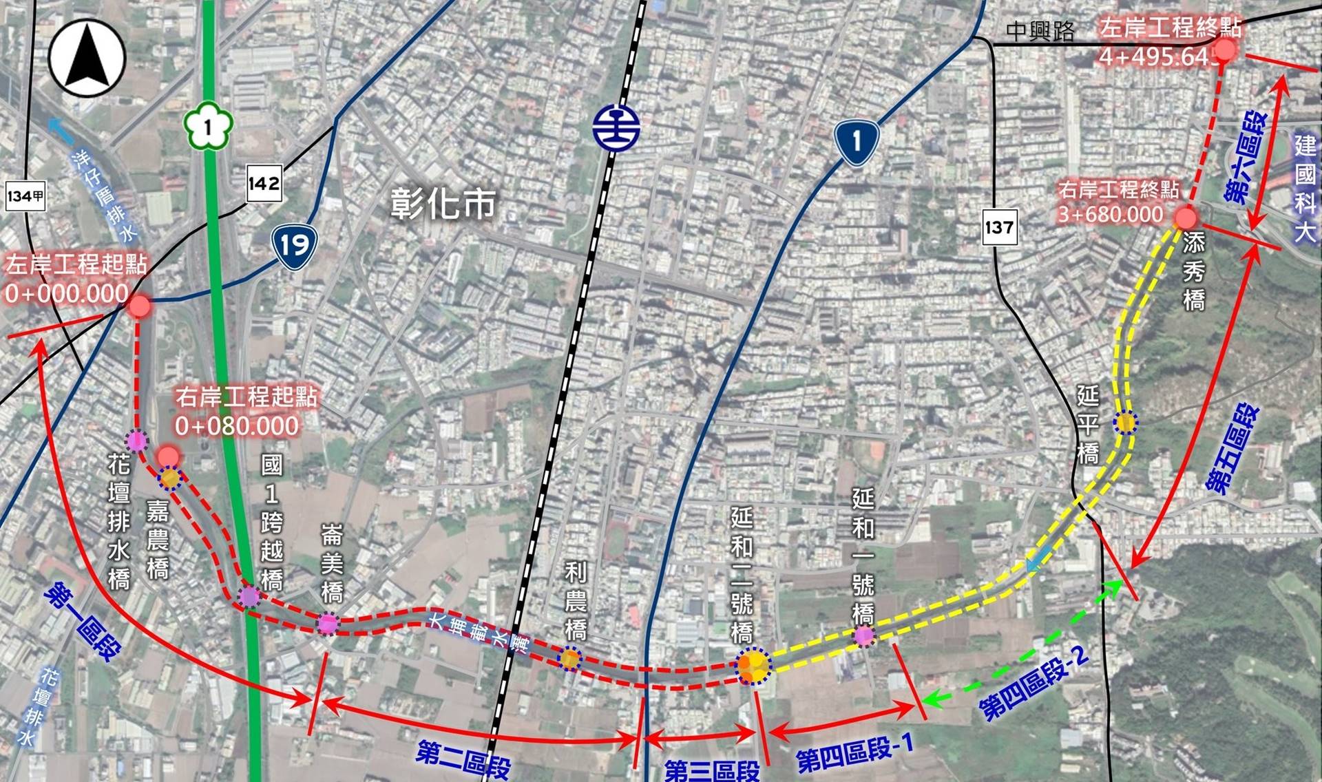 彰化縣政府工務處表示,工程預計分為六工區施作,第一工區為台19線(彰水橋)至崙美橋路段、第二工區為崙美橋至省道台1線路段、第三工區為省道台1線至延和二橋路段、第四工區為延和二橋至縣道137線路段、第五工區為縣道137線至建國科技大學路段,第六工區為建國科技大學至中興路與介壽北路口路段。