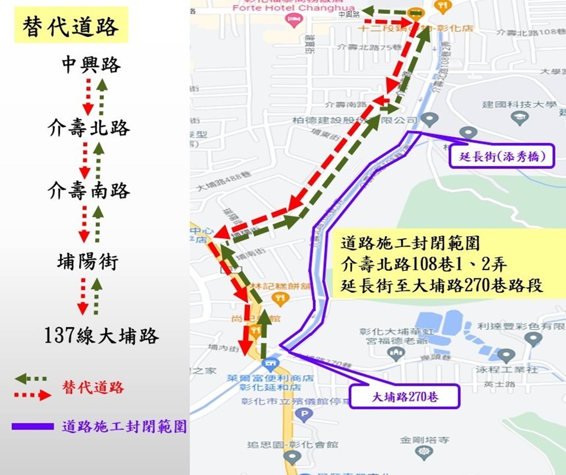 工務處指出,工程目前先行辦理第五工區(大埔路至延長街路段),配合清明連假期間,避免影響交通,自112年4月6日起至114年5月31日止,封閉介壽北路108巷1、2弄延長街(添秀橋)至大埔路270巷路段,採全線全日封閉,請用路人配合交通管制,並改走替代道路:中興路-介壽北路-介壽南路-埔陽街-大埔路,如造成不便,敬請見諒。