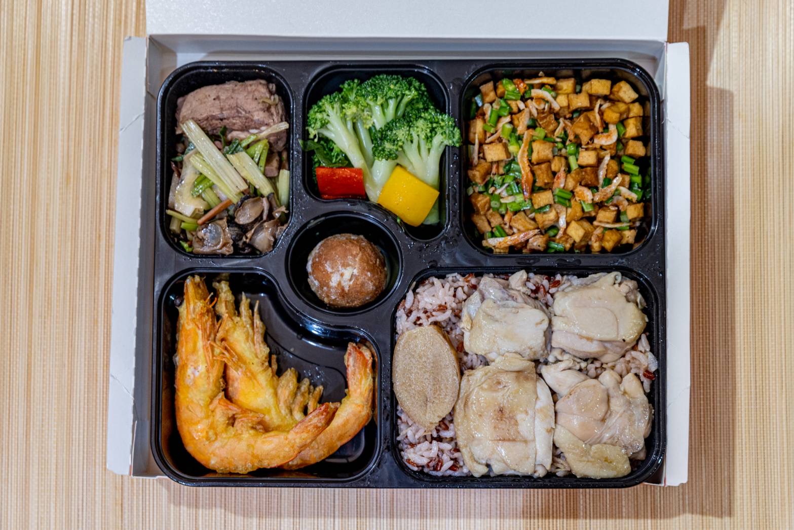 酒家菜源自北投招待貴賓的精緻宴飲,為慶祝車站生日,便當主食「麻油雞飯」特別加入花蓮太巴塱部落種植的紅糯米,紅糯米為早期部落招待貴客、慶典時的珍貴食材,耀眼的紅寶石色澤增添喜氣。主菜「油爆蝦」,蝦肉飽滿、外酥內嫩。副菜魷魚螺肉蒜、櫻花蝦豆乾丁炒韭菜花、金沙芋泥球和清爽鮮蔬等,其中「魷魚螺肉蒜」更是酒家菜不可缺少的經典菜餚,此次主廚特地將湯品巧手烹調為便當配菜,細細品嘗,依舊是記憶中那熟悉的古早味。