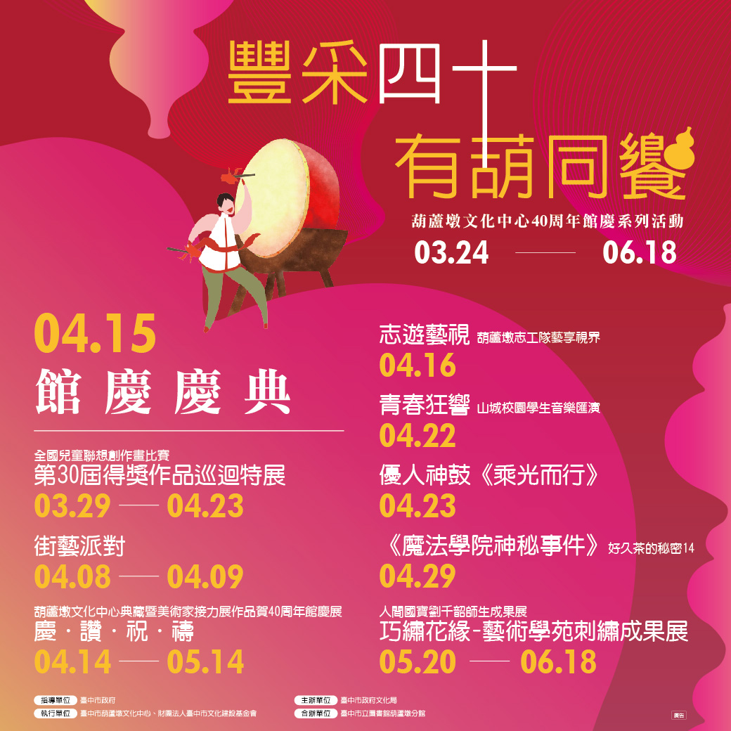 台中市葫蘆墩文化中心說,「豐采四十有葫同饗-40周年館慶」活動詳情請至葫蘆墩文化中心官網(https://www.huludun.taichung.gov.tw/)或粉絲專頁(https://www.facebook.com/huludun.taichung/) 查詢,歡迎闔家來看表演、逛市集、抽大獎,一同見證葫蘆墩迎向下一個精采40年。