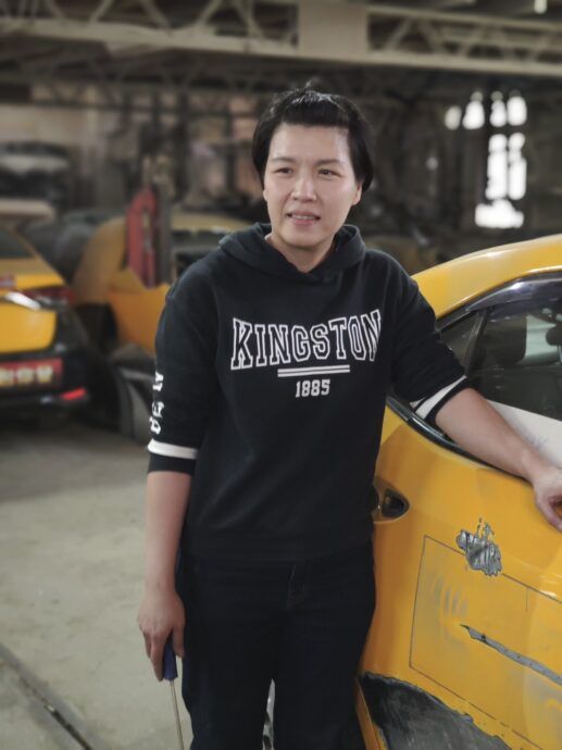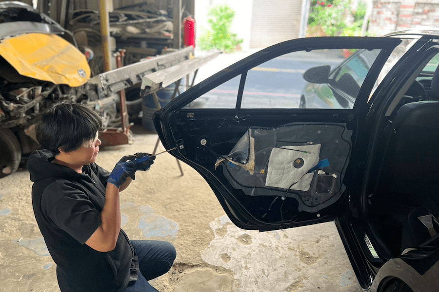 有個穿著黑色休閒服與深色牛仔褲的身影,穿梭在工具檯與車輛之間,她拿著螺絲起子彎身在一台黃澄澄的計程車旁,眼神專注,沒幾秒鐘,俐落的身手已將車門上的把手卸除。她是江淑女,兩個孩子的媽媽,在汽車修護廠擔任會計,一年前透過新北勞工局所屬職訓中心所開辦的「汽車修護證照輔導課程」,成功晉身汽車修護雙證照能手。