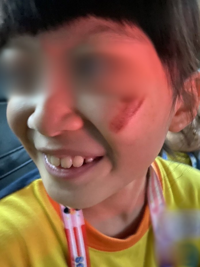 9歲女童的臉頰上,有一道明顯的紅色血痕,甚至還有瘀青,這個月5日,她跟家人來到台中軟體園區遊玩,因為傍晚視線昏暗,沒注意到人行道旁邊的樹木,綁了好幾條鋼索,不小心被絆倒刮傷了臉,女童父親表示,當時小朋友太興奮,一下車就衝往餐廳,跨過草皮區時,不慎撞到鋼索受傷。