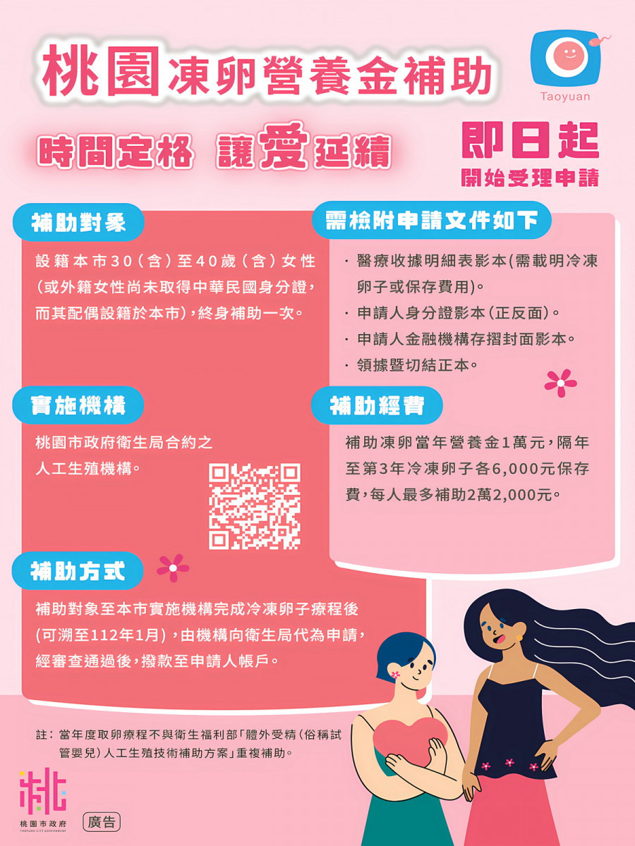 「桃園凍卵營養金補助」17日受理申請,凡設籍桃園市30(含)至40歲(含)女性或配偶設籍於桃園市之尚未取得中華民國身分證之外籍民眾,於今(112)年1月起,至林口長庚紀念醫院、衛生福利部桃園醫院、敏盛綜合醫院、桃園秉坤婦幼醫院、宏其婦幼醫院、惠生婦產科診所、婦茂婦幼診所、禾馨宜蘊婦產科診所、桃園宏其生基診所等9家,桃園市合約之人工生殖機構完成冷凍卵子療程,均可申請補助營養金1萬元。
