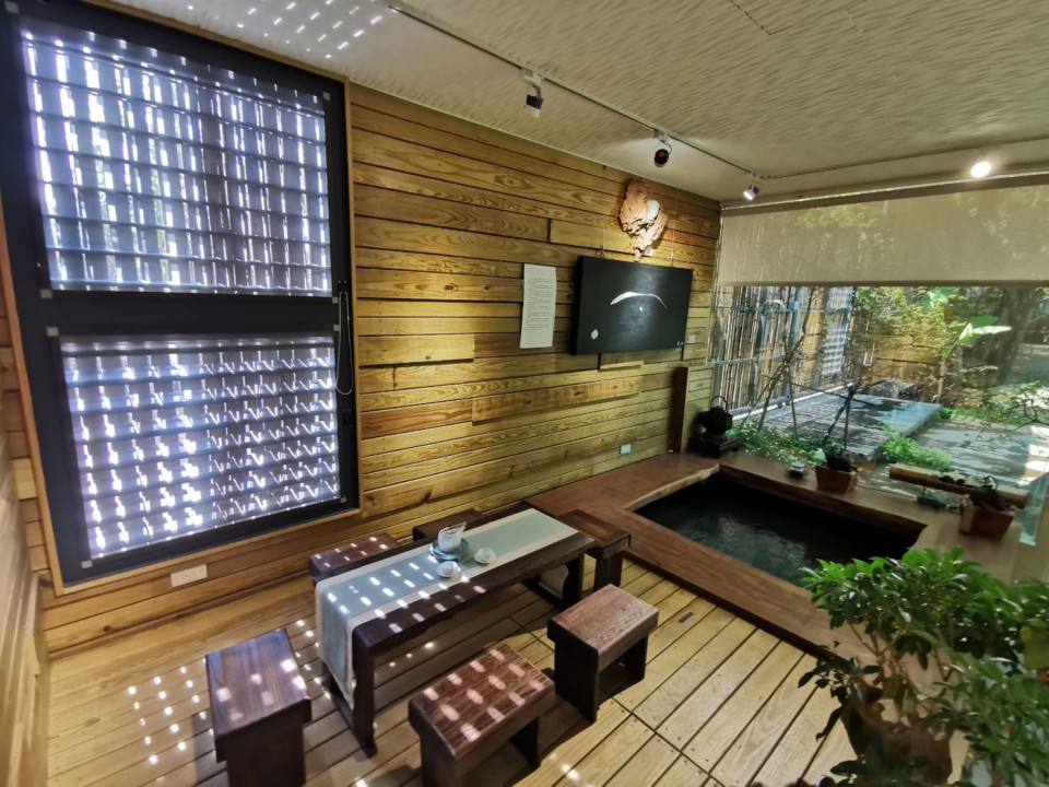 張秀如董事長精心打造的「雅園溏」,最大特色是,將老宅種植4、50年的樹木,如大花紫薇丶蘋婆丶龍眼丶荔枝丶芒果、肉桂等樹木全部保留下來,並巧妙運用鄰近大坑在地富有人文氣息的竹子,搭配自然貭樸的原木,依照樹形及環繞池塘建造而成的茶空間,一間間錯落有致,每個茶席空間各自獨立,景觀各有不同,有的在竹材步道的轉角處,有的在竹材搭建的平台上面,居高臨下。甚至有貼近池塘邊闢建的水屋,可以邊喝茶邊賞湖景,非常雅致,取名很有詩意的「在水一方」;另一處也是臨湖以水泥打造的泥屋,兩邊都有臨水的窗景,因外形似寶瓶,而名為「寶瓶泥屋」。此外,還有室內的茶席空間,搭配字畫、花藝及鐵壺、茶倉等茶器具,別有一番優雅美境。