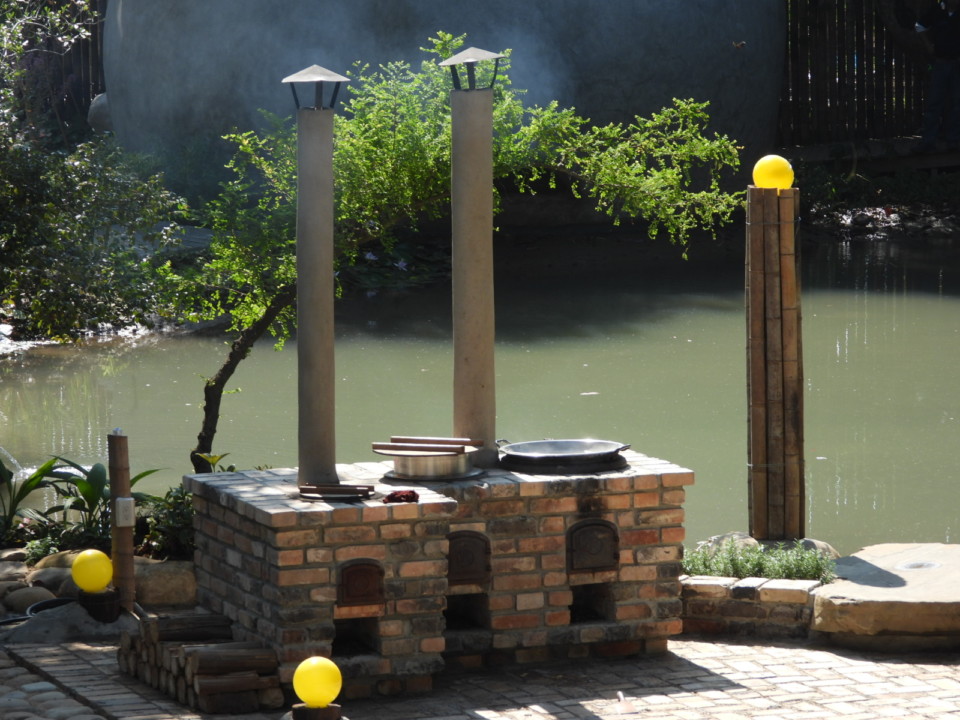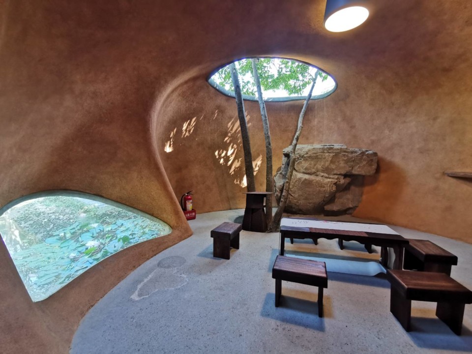 雅園溏配合茶席泡茶所需的熱水,室外空間還搭建了一座燒柴的老灶,每當升火燒柴時,只見白色炊煙自兩支煙囪裊裊上升,特別有一種思古幽情的境況,平添優閒雅致;三個灶口除了燒開水之用外,還可以用來炒花生或以普洱茶煮茶葉蛋,添增佐茶美味。