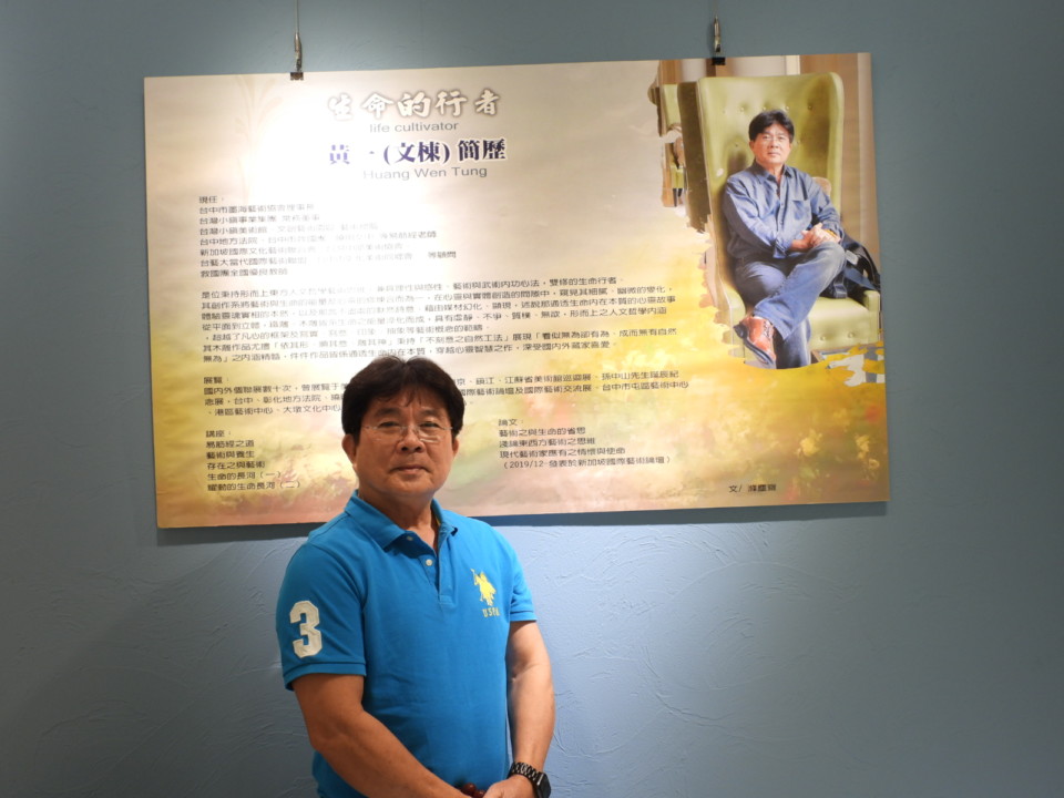 《茶與藝術的對白》創作展展出藝術家黄一,本名黃文棟,現任台中市墨海藝術協會理事長及江蘇省台灣小鎮美術館藝術總監,曾舉辦多次個展及參加海內外聯展,此次展出20件油畫及雕塑作品。黃文棟也是著名的易筋經老師。