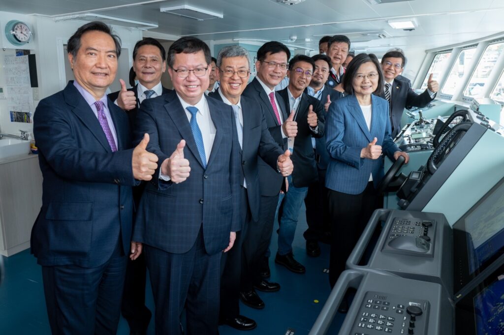 總統蔡英文、行政院長陳建仁、行政院副院長鄭文燦、總統府秘書長林佳龍、交通部長王國材、連江縣長王忠銘等人今天下午出席新台馬輪的首航典禮。