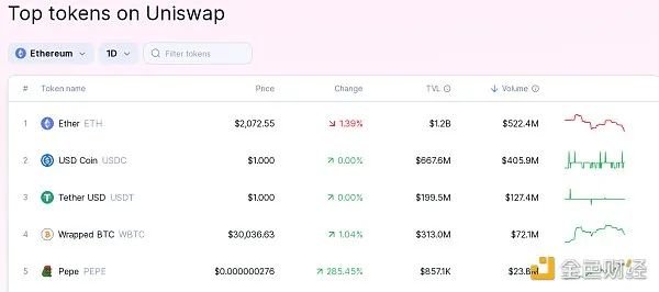 當然也吸引了很多 smart money 或者內幕者的投機,而且字面收益非常高。比如,以 0x4a 開頭的 Smart Money4 月 15 日花費 0.125 枚 ETH(約 251 美元)購買了 5.9 兆枚 PEPE,截至發稿,字面市值達到約 170 萬美元。也就是說 4 天的字面收益超過 6000 倍。也因其高熱度,PEPE 排在 Uniswap 上 Top 代幣前五位置。