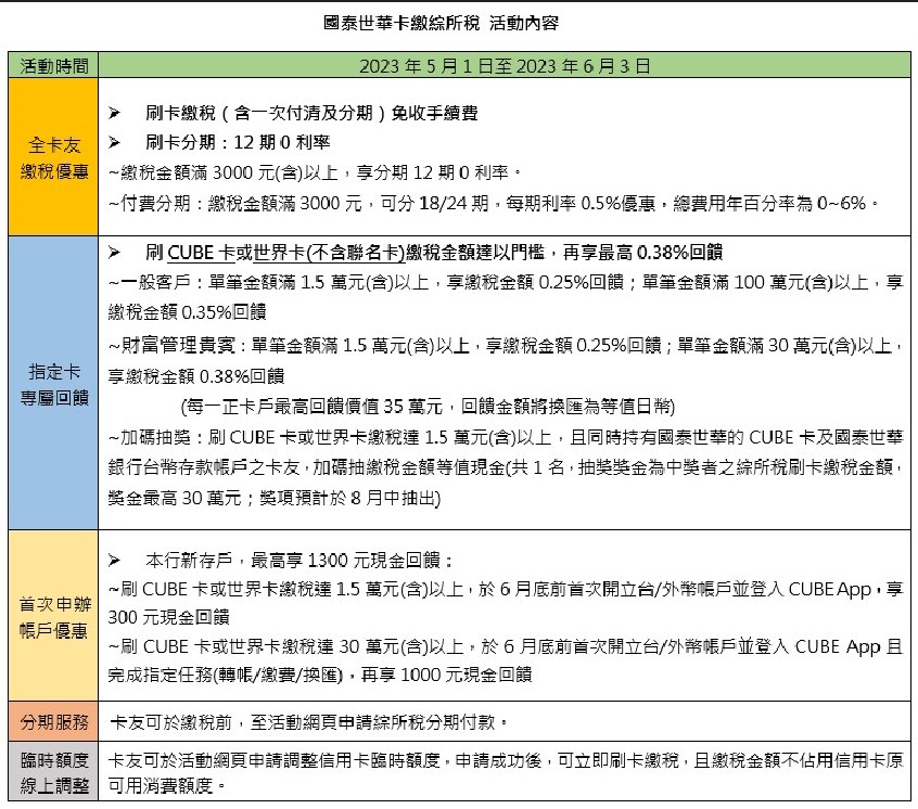 國泰世華銀指出,自5月1日起至6月3日止,只要刷國泰世華卡繳納「111年度綜所稅」,不限金額皆免手續費,單筆繳稅金額達3000元(含)以上,即享分期12期0利率。