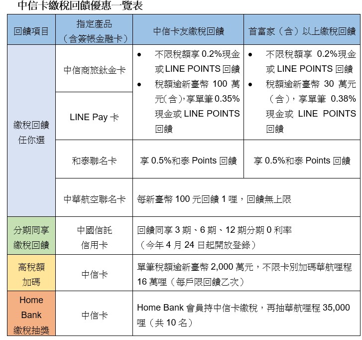 中國信託商業銀行(簡稱「中信銀行」)也推出「中信卡繳稅回饋分期双享」活動, 5月1日起至6月3日止,持中信商旅鈦金卡、LINE Pay信用卡及簽帳金融卡、和泰聯名卡或中華航空聯名卡繳納綜所稅,可享現金、LINE POINTS、和泰Points或華航哩程等多元回饋,單筆稅額滿2000萬元,再加碼華航哩程16萬哩,回饋率最高達2.45%,中國信託信用卡不限卡別,皆享固定額度內最高12期分期0利率優惠。