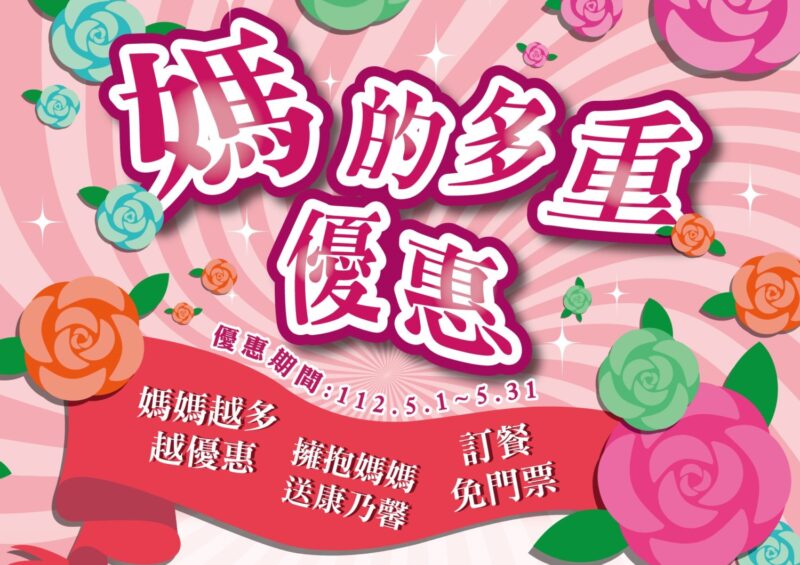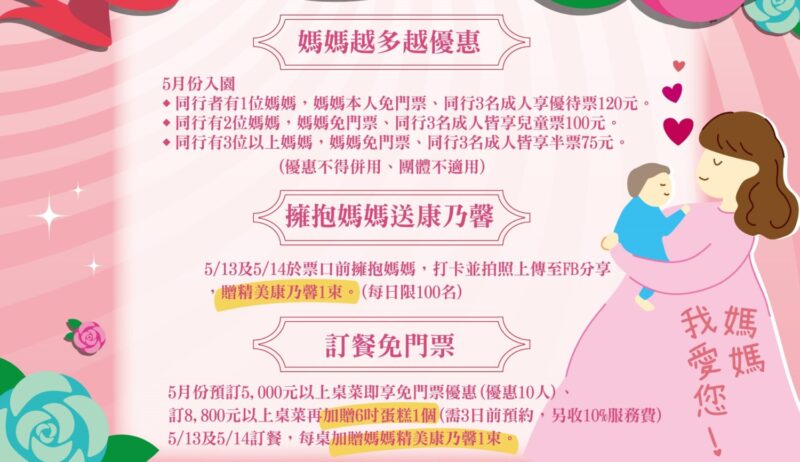 此外,凡預訂5000元以上的桌菜,全桌(10)人皆免收門票;預訂8800元以上的桌菜,還會再贈送6吋母親節蛋糕1個。在母親節當週末(5月13、14日)用餐,或是在票口前擁抱媽媽並上臉書打卡分享,媽媽們即可獲得康乃馨1束。