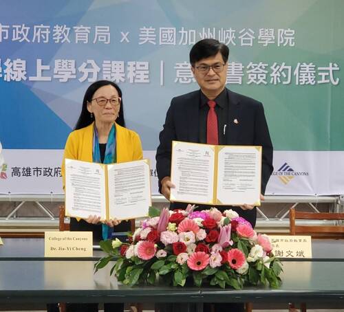 上午的簽約儀式,在新莊高中舉行,由教育局長謝文斌與峽谷大學院長鄭佳宜代表簽署,美國在台協會高雄分處首席商務官艾達文、立峰國際教育發展協會理事長李吳釩等到場,與新莊高中校長陳良傑、雄女校長鄭文儀、小港高中校長陳建民、教育局國際科科陳盟方等人共同見證。