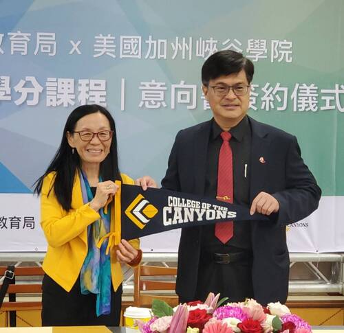 圖/高市教育局由局長謝文斌(右)代表,與美國峽谷大學院長鄭佳宜(左)簽署國際教育合作。(記者陳雯萍攝)