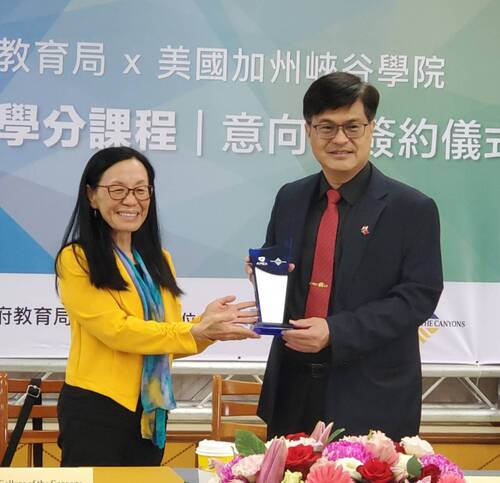 圖/美國峽谷大學院長鄭佳宜(左)贈送學校紀念品予高市教育局長謝文斌(右)。(記者陳雯萍攝)