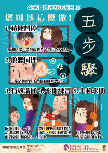 社會局局長謝琍琍呼籲家長,當發生親子管教衝突時,建議可以學習下列方式,不再使用體罰管教孩子。若有親職教育困擾需求,可撥打全國家庭教育諮詢專線412-8185、高雄市親職教育諮詢專線07-3878970。