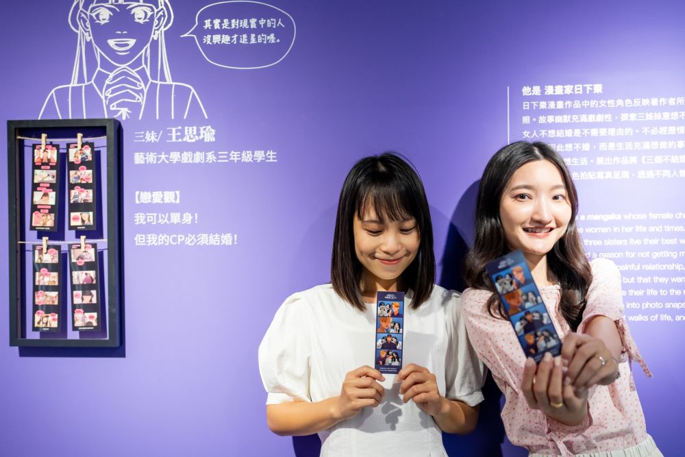 繪師天之火的《台灣OL系列》插畫作品,透過鐵窗花以及壓花玻璃作成的裝置,結合藝術家鄭鴻展的微縮作品,共同形塑出台灣上班族通勤日常。漫畫家日下棗《三個不結婚的女人》則以拍貼機作為載體,將漫畫變成人生四格的角色拍貼寫真呈現,觀眾也可以選擇角色進行拍貼體驗!