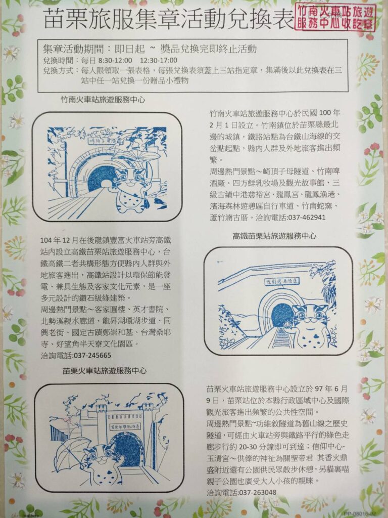 文觀局長林彥甫表示,苗栗縣旅遊服務中心是來苗栗的旅客下站接觸第一個服務據點,旅服中心人員秉持熱情、友善的服務態度應對旅客需求,引導外地旅客體驗感受苗栗山海之美,苗栗縣目前在苗栗火車站、竹南火車站、高鐵苗栗站設有3處旅服中心,提供旅遊景點、交通食宿、解說導覽相關資訊及遊程規劃諮詢、文宣及地圖索取等服務,預計此次活動將可提升旅客到站諮詢率約二成以上,集章活動相關訊息可搜尋「苗栗玩透透」官方粉絲專頁。