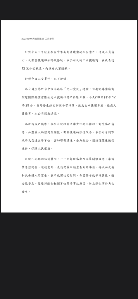 針對今天下午發生在台中市南屯區建案的工安意外,造成人員傷 亡,及影響捷運部分路段停駛,本公司及施工承攬廠商,在此表達 12 萬分的歉意,向社會大眾道歉。