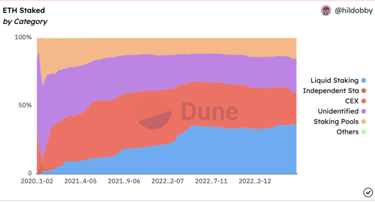 上海升級後,中心化質押(Kraken、Coinbase、Binance 等 CEX)的鎖倉量下降,而去中心化質押協議的鎖倉量反而上升。