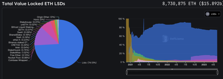 特別是 Lido、Rocket Pool 和 Frax LSD 等協議質押量上升,4 月 13 日,共有約 773 萬枚以太坊鎖定在 LSD 協議中,而到了 5 月 11 日,則增加到了 873 萬枚 ETH,價值 159 億美元。主要是因為這些 LSD 允許用戶利用其基於以太坊的衍生產品參與一系列的 DeFi 交易和借代應用程式。