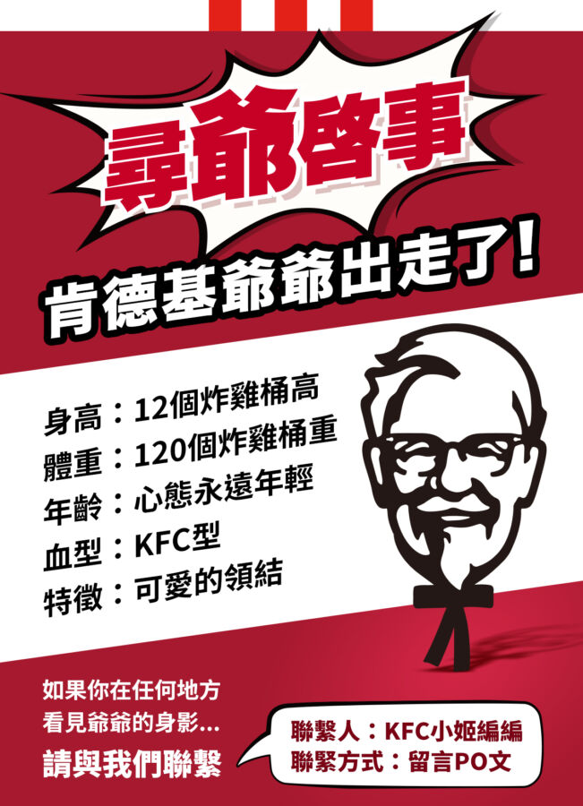 圖/肯德基發佈「尋爺啟事」肯德基爺爺驚傳出走。(肯德基提供)