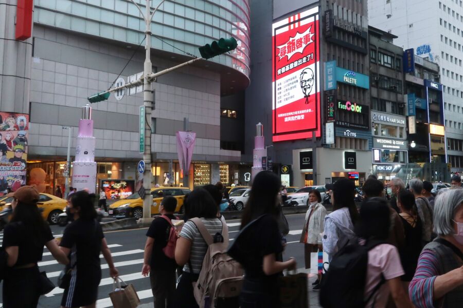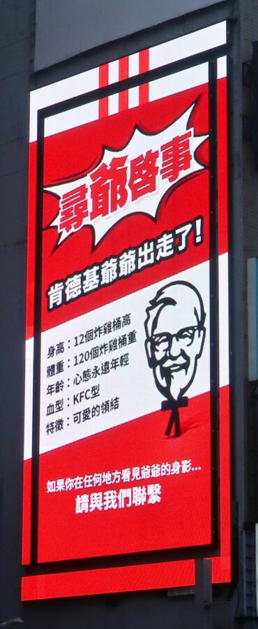 圖/台北市南西商圈電子看板上竟出現大幅肯德基「尋爺啟事」,引發路人討論。(肯德基提供)
