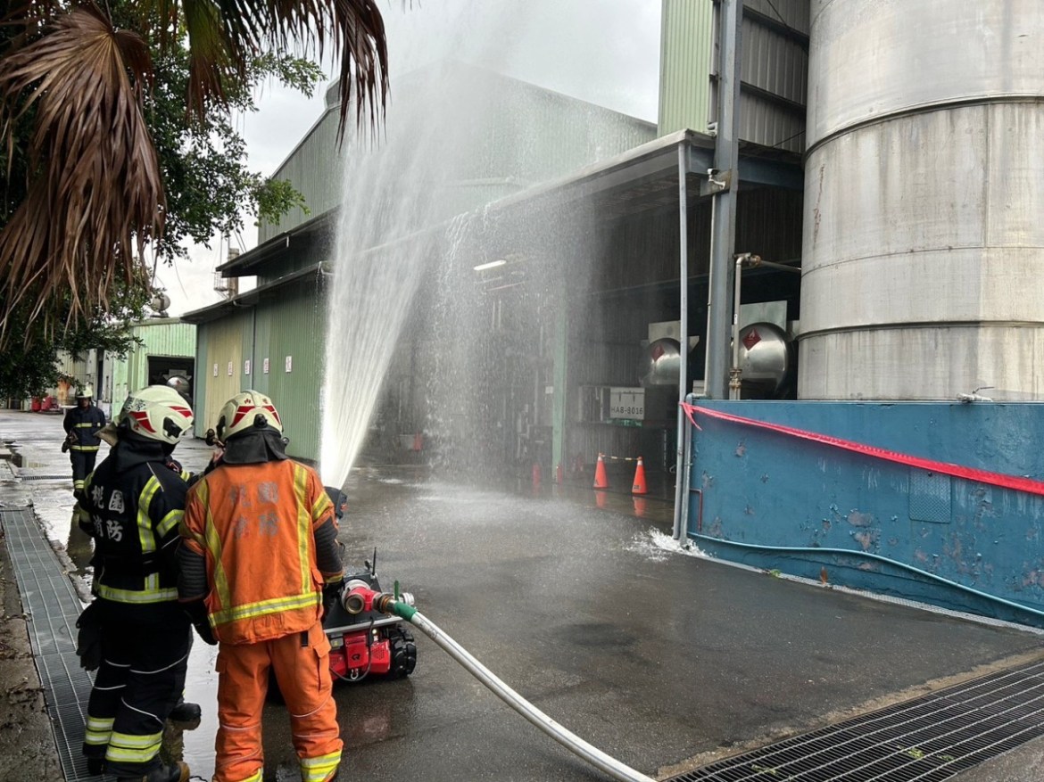 桃園市消防局第二救災救護大隊為提升轄內化學工廠防災意識及消防搶救能力,今(19)日在楊梅區萬洲化學股份有限公司舉辦自衛消防編組暨火災搶救演練。透過這次的活動,不僅提升了員工對災害應變措施的認識,也強化了消防面臨化學工廠發生火災時的應變能力。