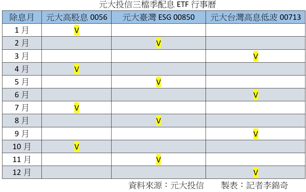 高股息ETF(0056)未來除息月份訂為1、4、7、10月,臺灣ESG永續ETF(00850)未來除息月份訂為2、5、8、11 月;至於原本就採季配息的高息低波ETF(00713),每年3、6、9、12 月除息。換句話說,以後每個月,都會有一檔ETF除息,滿足存股族期望。