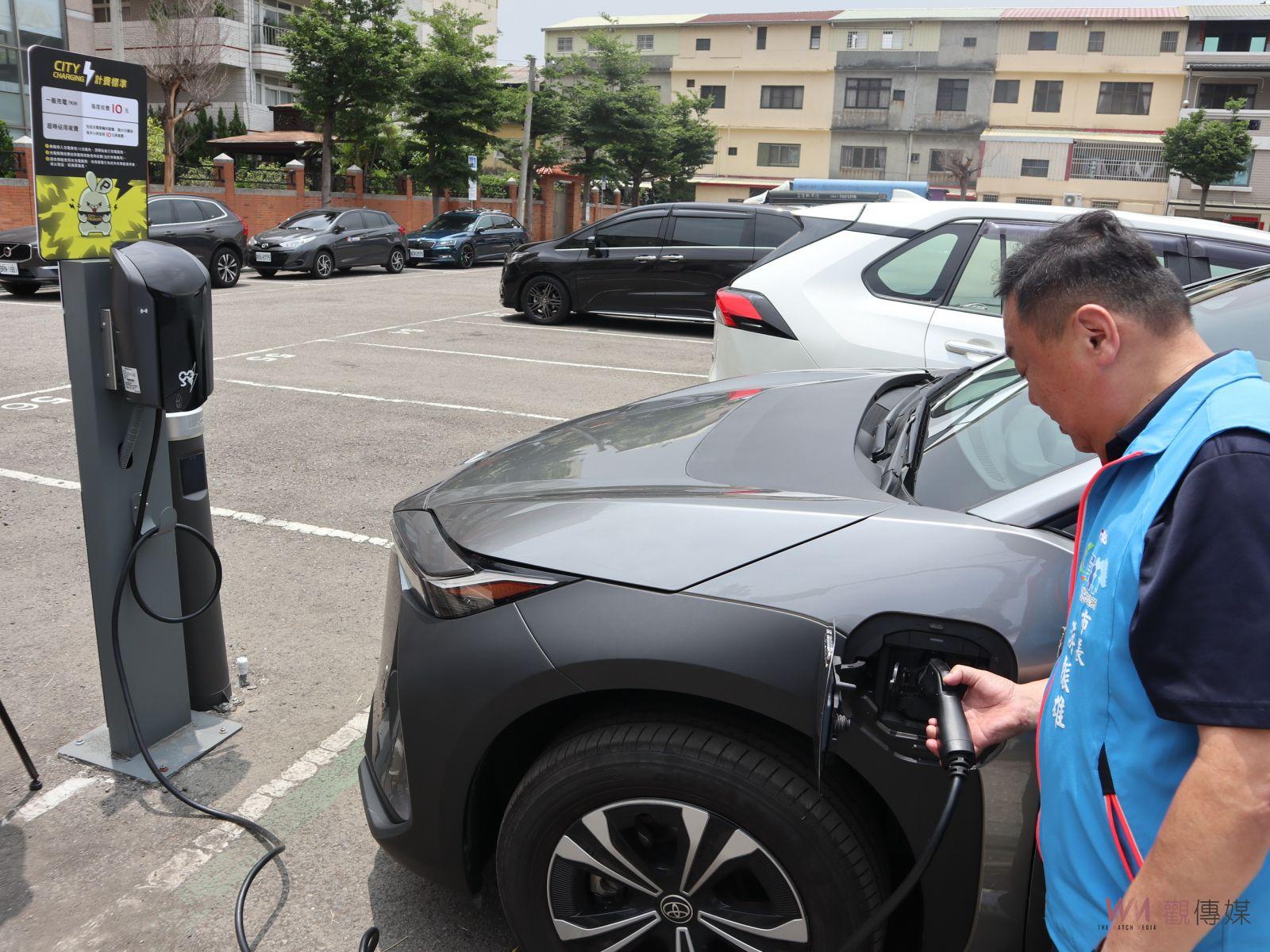 ▲員林市公所首座電動汽車充電樁6月1日啟用,員林市長游振雄歡迎駕駛電動車民眾踴躍使用。
