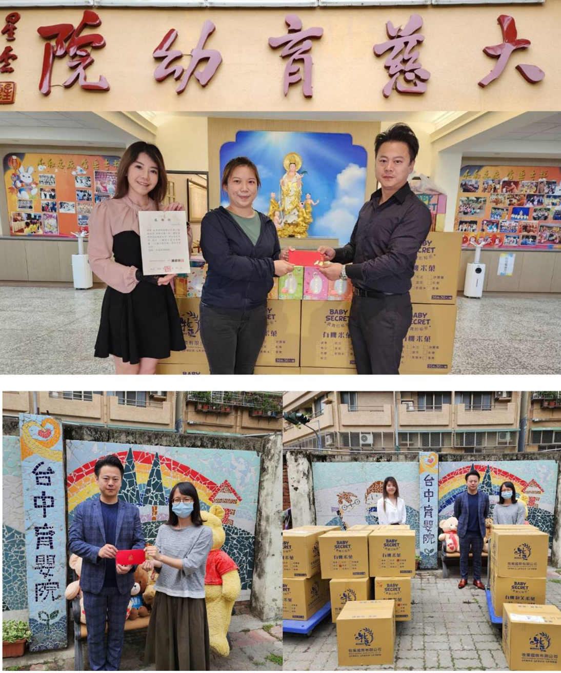 ▲ 圖上牧菓國際創辦人黃士旗及李星嬡與佛光山大慈育幼院老師,圖下牧菓國際創辦人黃士旗及台中育嬰院。(圖/牧菓國際提供)
